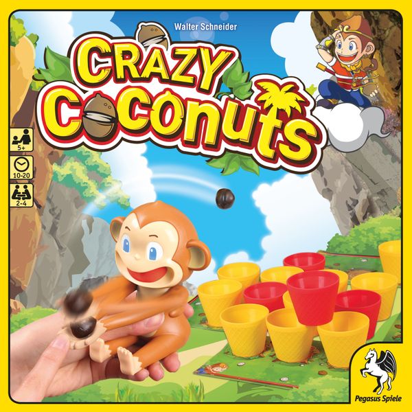 プレイヤーは自分の猿にココナッツをセットし、相手のカップや中央のカップを狙って発射。カップを獲得し、ピラミッド状に6個並べたら勝利となります。