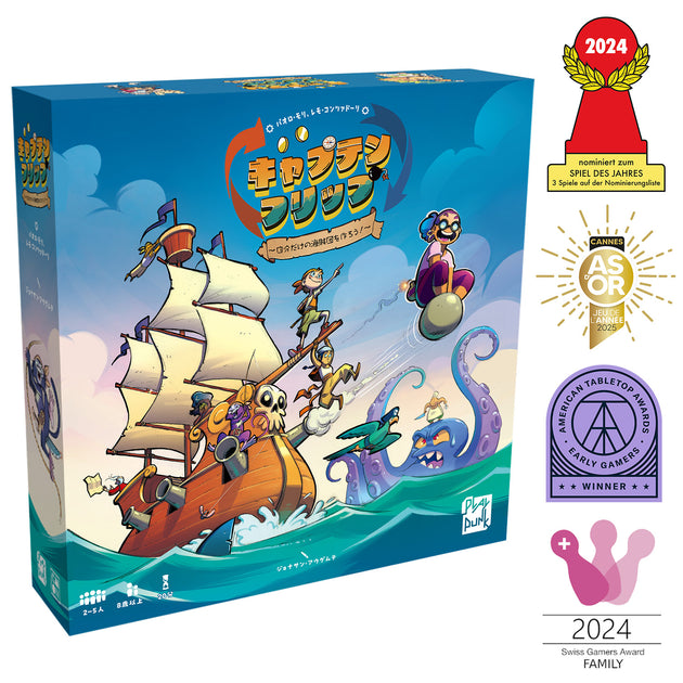 海賊船をテーマにしたタイル配置ゲーム。「見えているキャラクターを取るか、裏返して未知に賭けるか」の選択がジレンマを生みます。