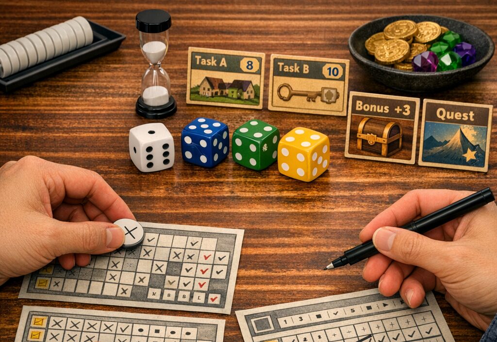 数字を並べたり、セットを作ったりする楽しさは、紙ペンゲームの大きな魅力です。「クウィックス」では左から右へ数字を埋めていき、「クウィント(Quinto)」では同じ列に同じ数字を使えないという制約があります。こうした“数字のパズル”が、シンプルなのに奥深く、埋めるたびに小さな達成感をくれます。